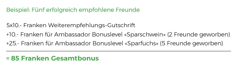 Um dein Engagement noch mehr zu belohnen, zahlt dir unsere Plattform jetzt neu einen zusätzlichen Bonus aus! Für zwei erfolgreich empfohlene Freunde* erhältst du einen Bonus von 10.- Franken, für fünf Freunde einen Bonus von 25.- Franken, für zehn Freunde sogar einen Bonus von 100.- Franken und für 20 oder mehr Freunde geben wir dir zusätzlich 250.- Franken!