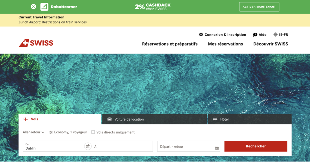 Si le chemin via www.rabattcorner.ch te semble trop compliqué, notre extension de navigateur est la solution parfaite. Elle s’installe en un clic et permet de savoir dès que tu es dans une boutique en ligne si elle est partenaire de notre site ou non. De plus, le cashback peut être activé facilement, comme ici avec l’exemple de SWISS :